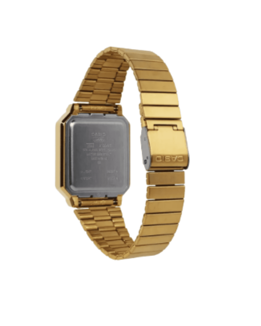 The A100 series is a reproduction of the F-100, CASIO’s first resin case model. The design has been updated for this more modern version while retaining the distinctive layout of the F-100’s four front buttons along with CASIO vintage metal elements.