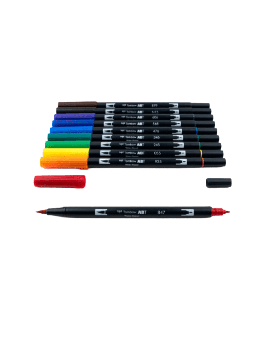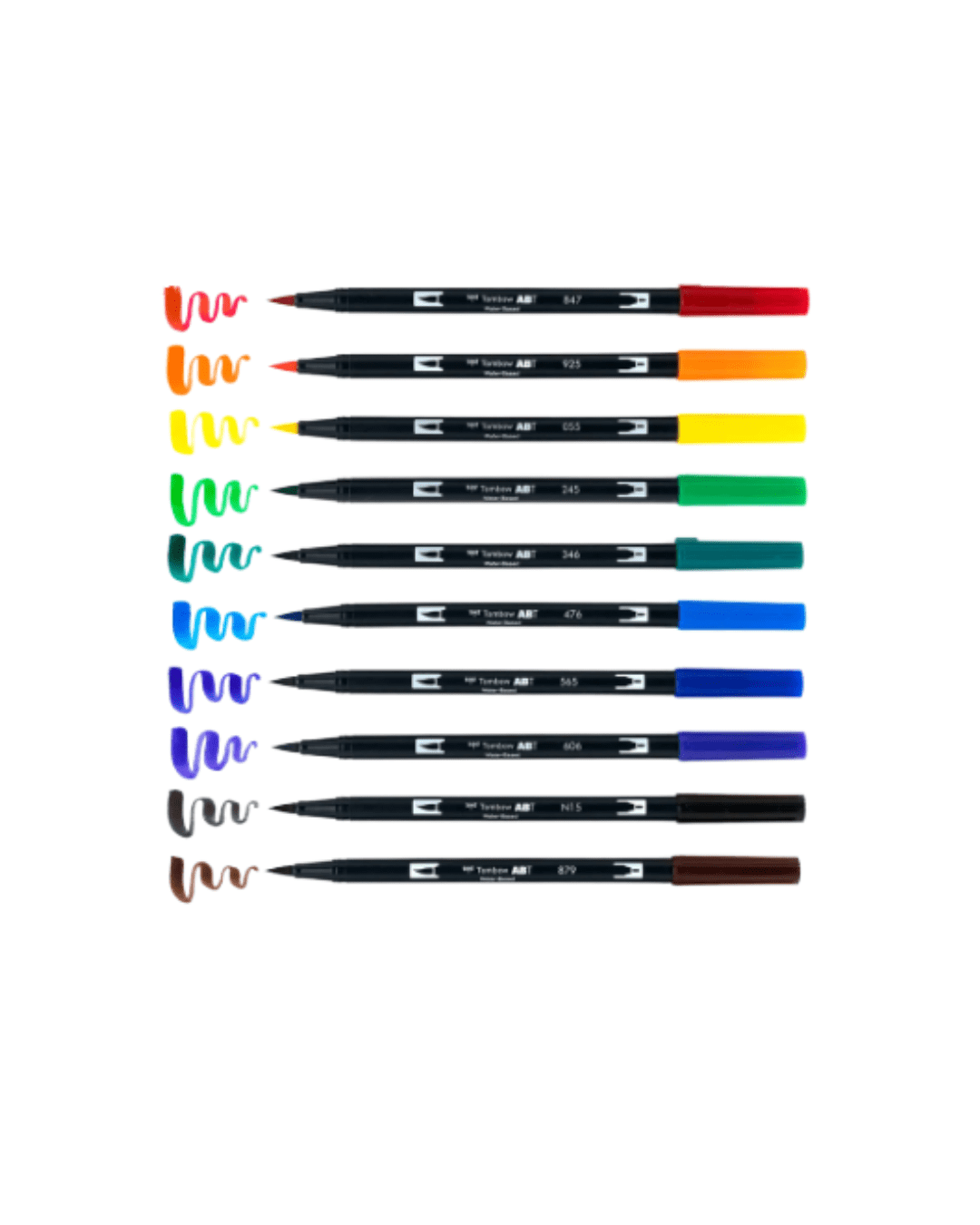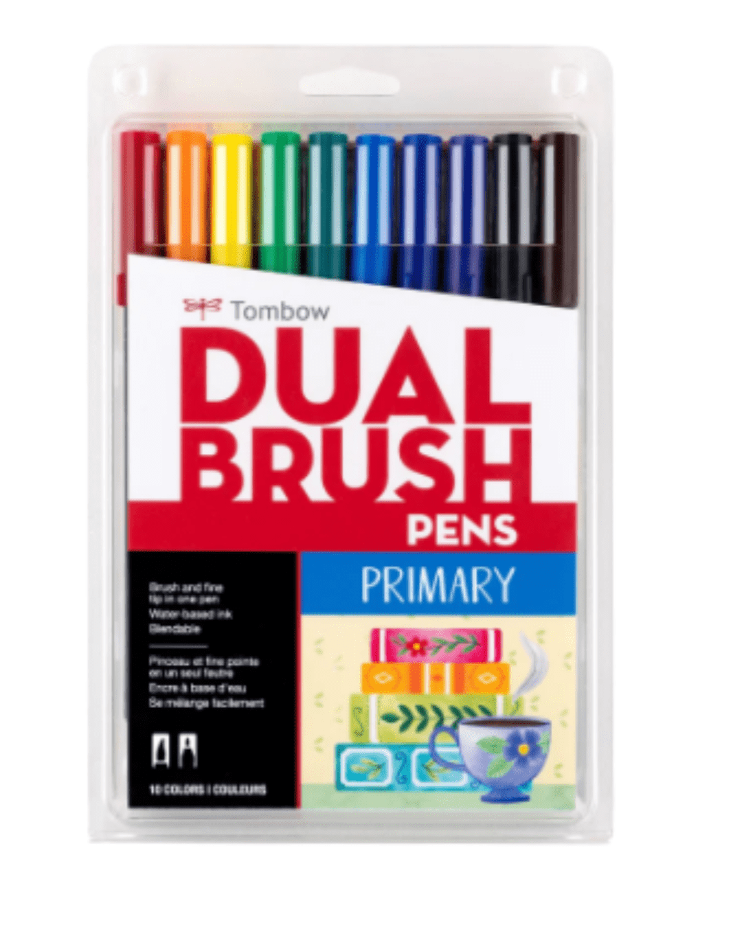 Set of 10 colors. Dual Brush Pens feature flexible brush tip and fine tip in one marker. Brush tip works like a paintbrush to create fine, medium or bold strokes; fine tip gives consistent lines. Dual Brush Pens are ideal for artists and crafters. The water-based ink is blendable and the resilient nylon brush retains its point stroke after stroke. Colors include: 847 Crimson, 925 Scarlet, 055 Process Yellow, 245 Sap Green, 346 Sea Green, 476 Cyan, 565 Deep Blue, 606 Violet, N15 Black, 879 Brown. Colorless Blender Pen not included.