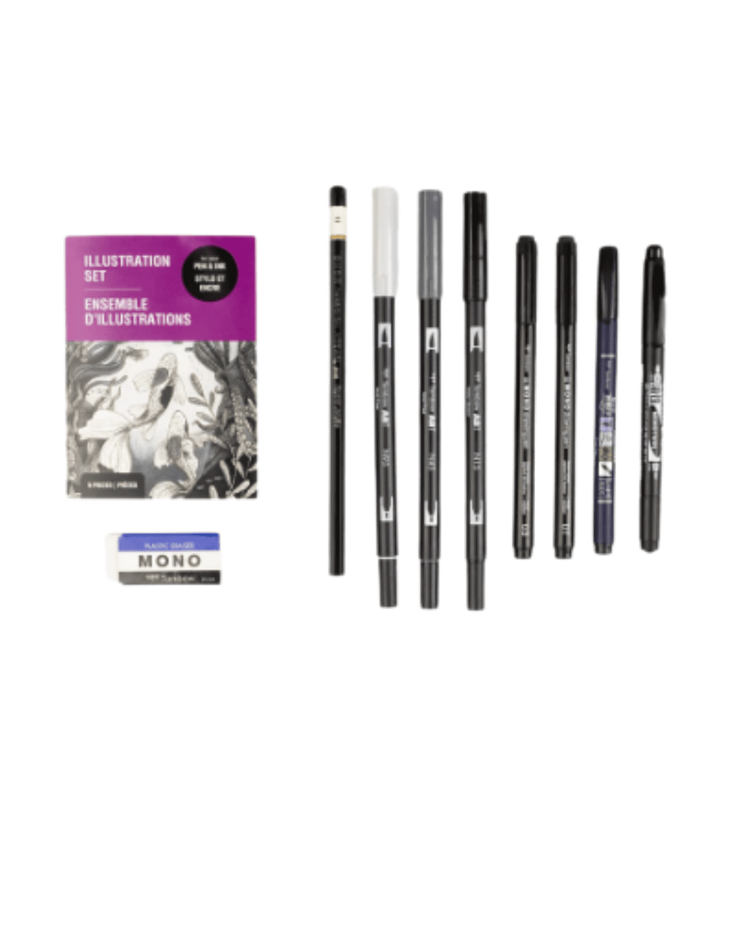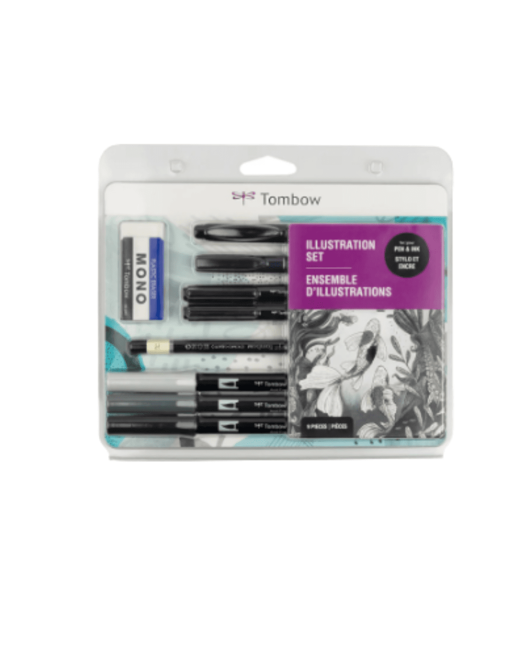 Tombow Illustration Set includes all the tools you need to create pen & ink drawings, sketches and illustrations. Contains instructional guide with helpful tips on basic drawing techniques, layering, value and composition. Features Dual Brush Pen art marker with flexible brush tip and fine tip in one. Set includes three Dual Brush Pens, two MONO Drawing Pens, Fudenosuke Brush Pen, MONO Twin Permanent Marker, MONO Drawing Pencil H and MONO Eraser.