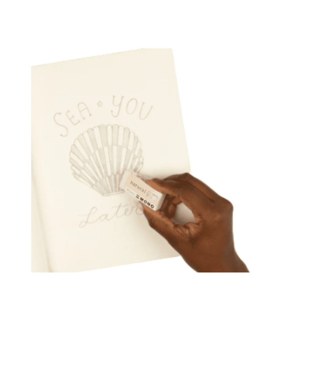 The MONO Natural Eraser is biomass-derived made from a minimum of 10% scallop shells! This new environmentally friendly eraser offers the same high-quality performance as the original MONO Eraser, cleanly removing unwanted lines and marks with little pressure and without damaging paper. The protective paper sleeve keeps eraser clean from graphite and other dust particles and is made with 70% wastepaper pulp. Great for art, school and office use. PVC and phthalate-free.